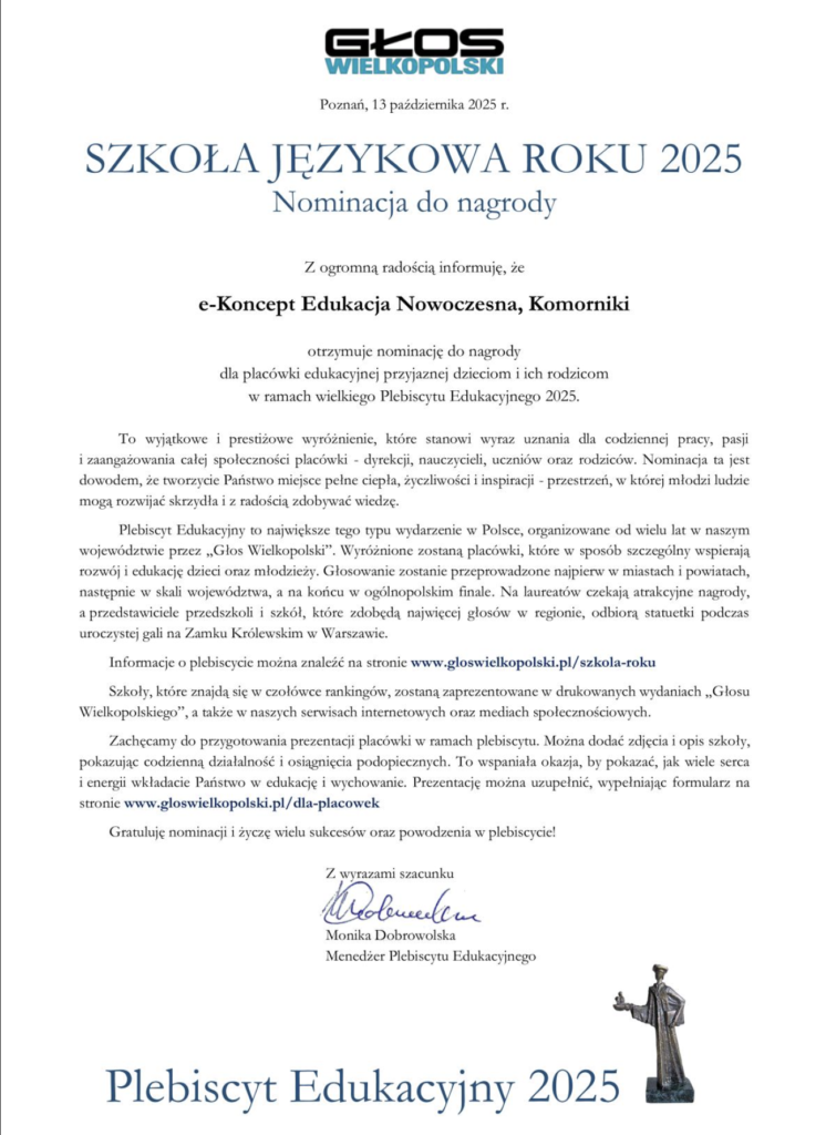 Jesteśmy ogromnie szczęśliwi i wdzięczni za to wyróżnienie! 🙏 To dla nas nie tylko zaszczyt, ale przede wszystkim motywacja, by wciąż się rozwijać i doskonalić nauczanie w e-Koncept Edukacja Nowoczesna. 💙